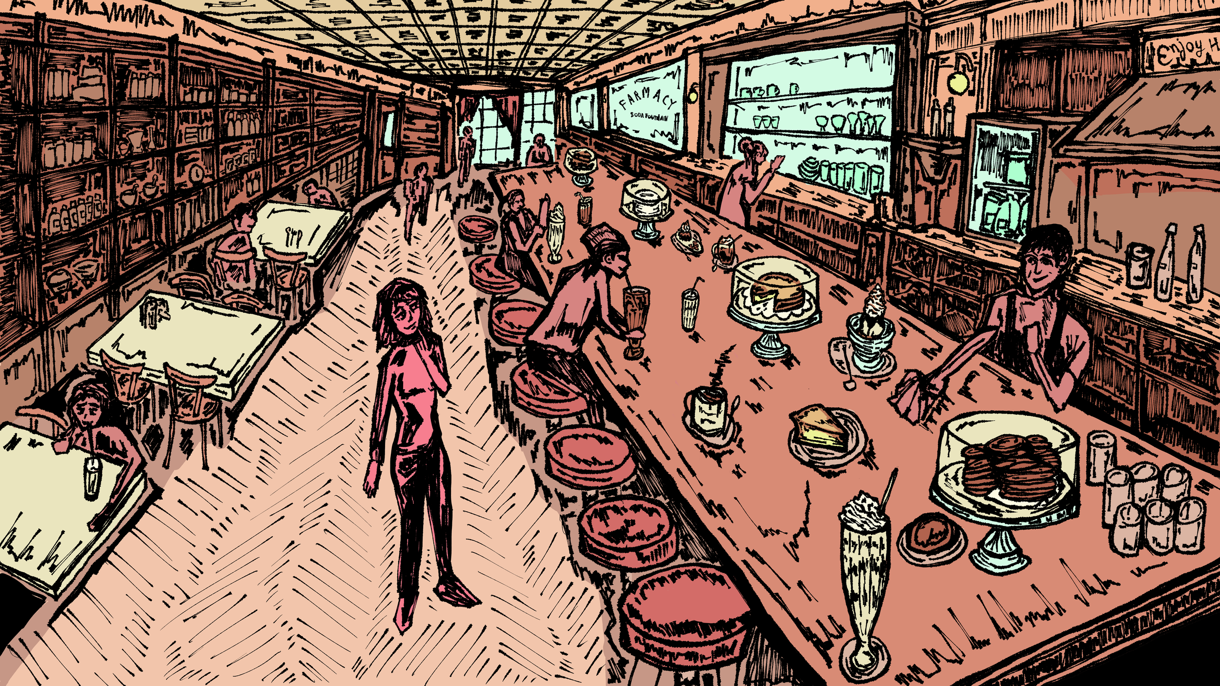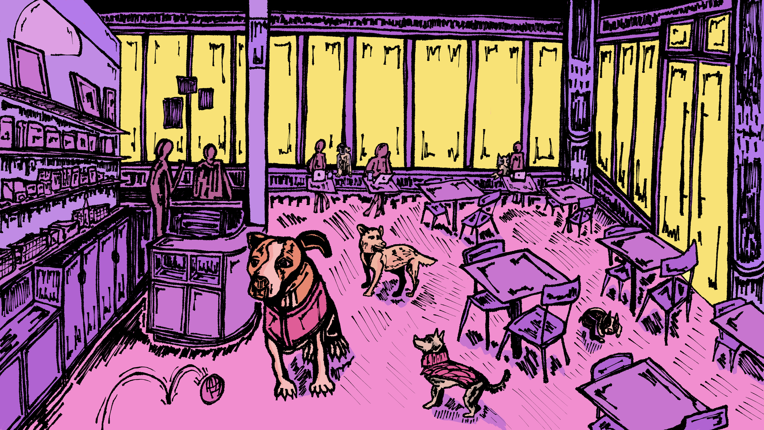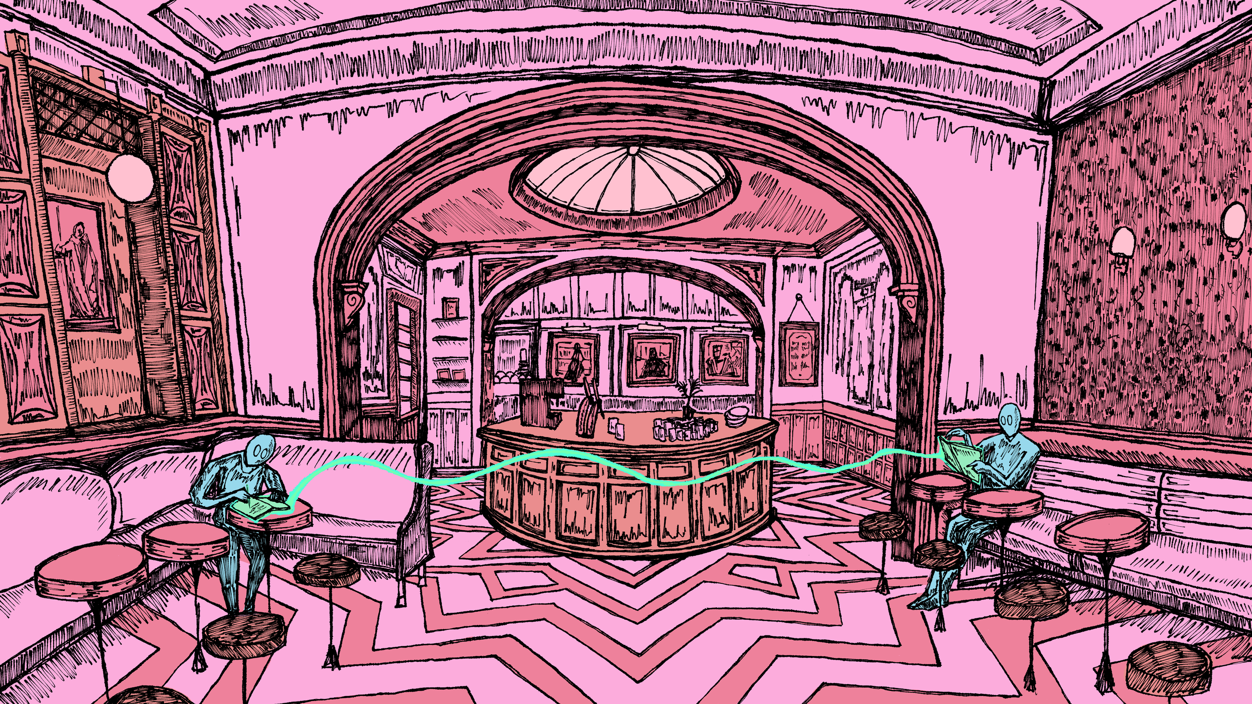 Writes & Bites is an ongoing series at the New School Free Press that reviews cafes and places to write in New York City while offering writing advice. Illustrations for this series are inspired by the interior of the place being reviewed and the associated writing topic.