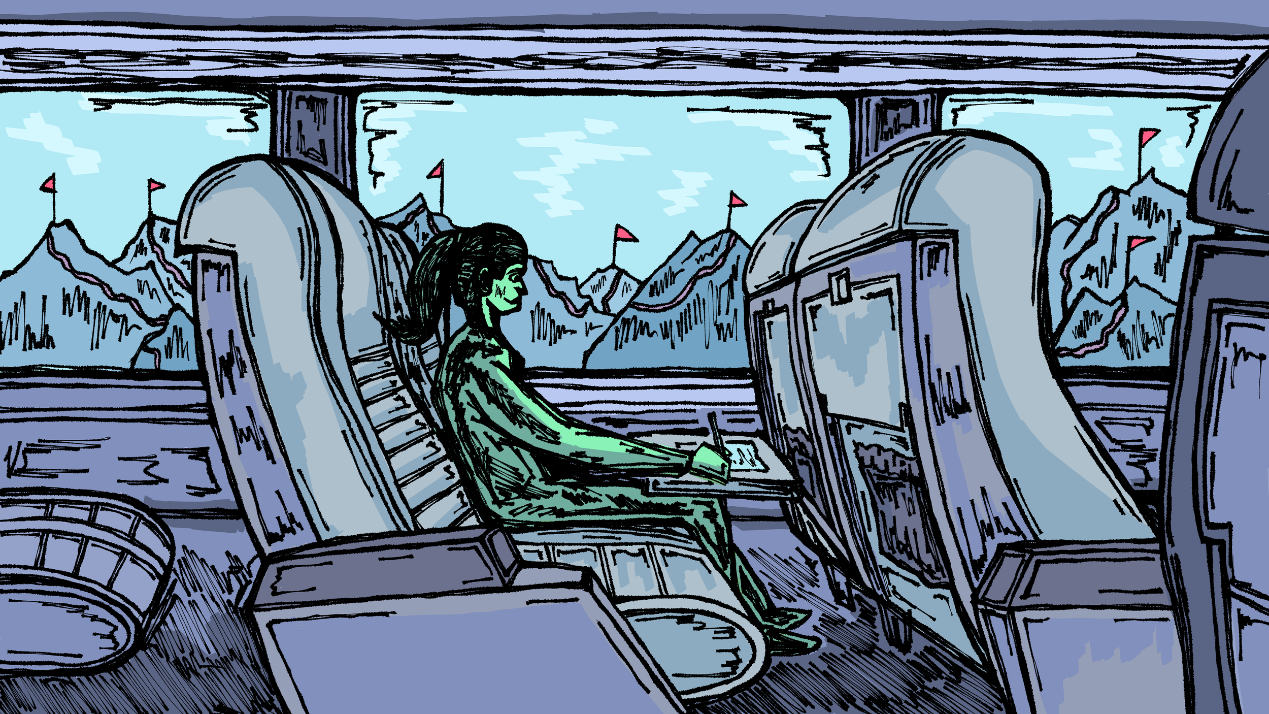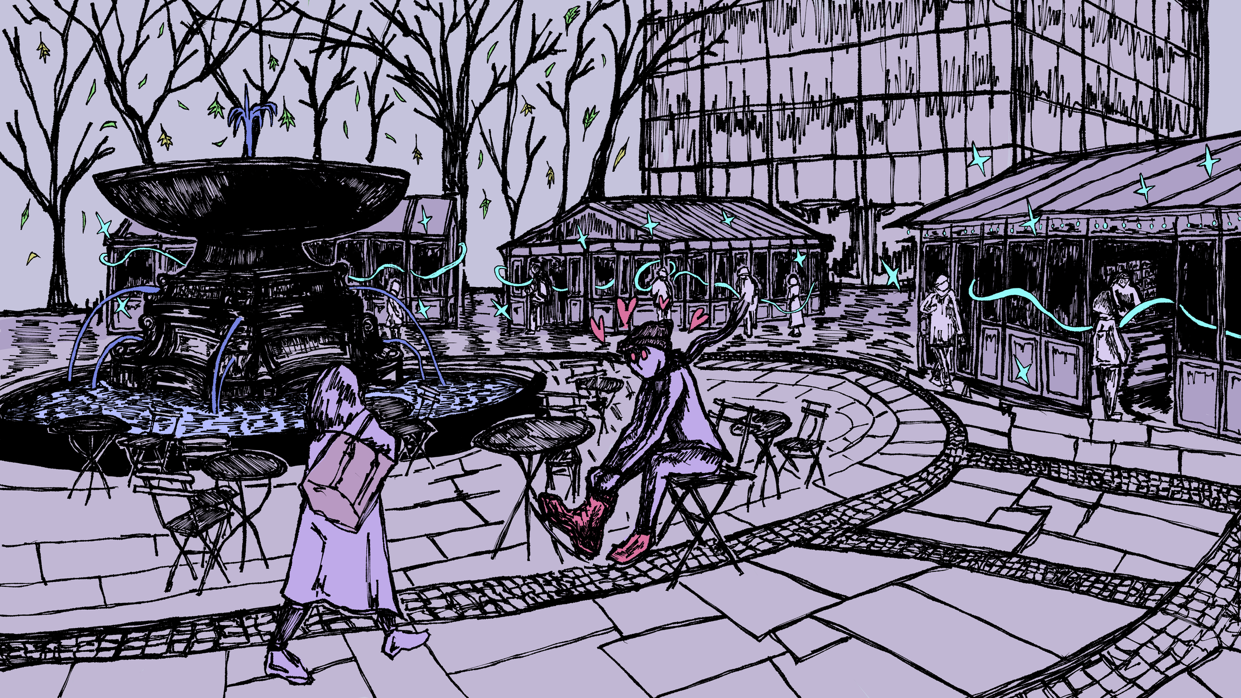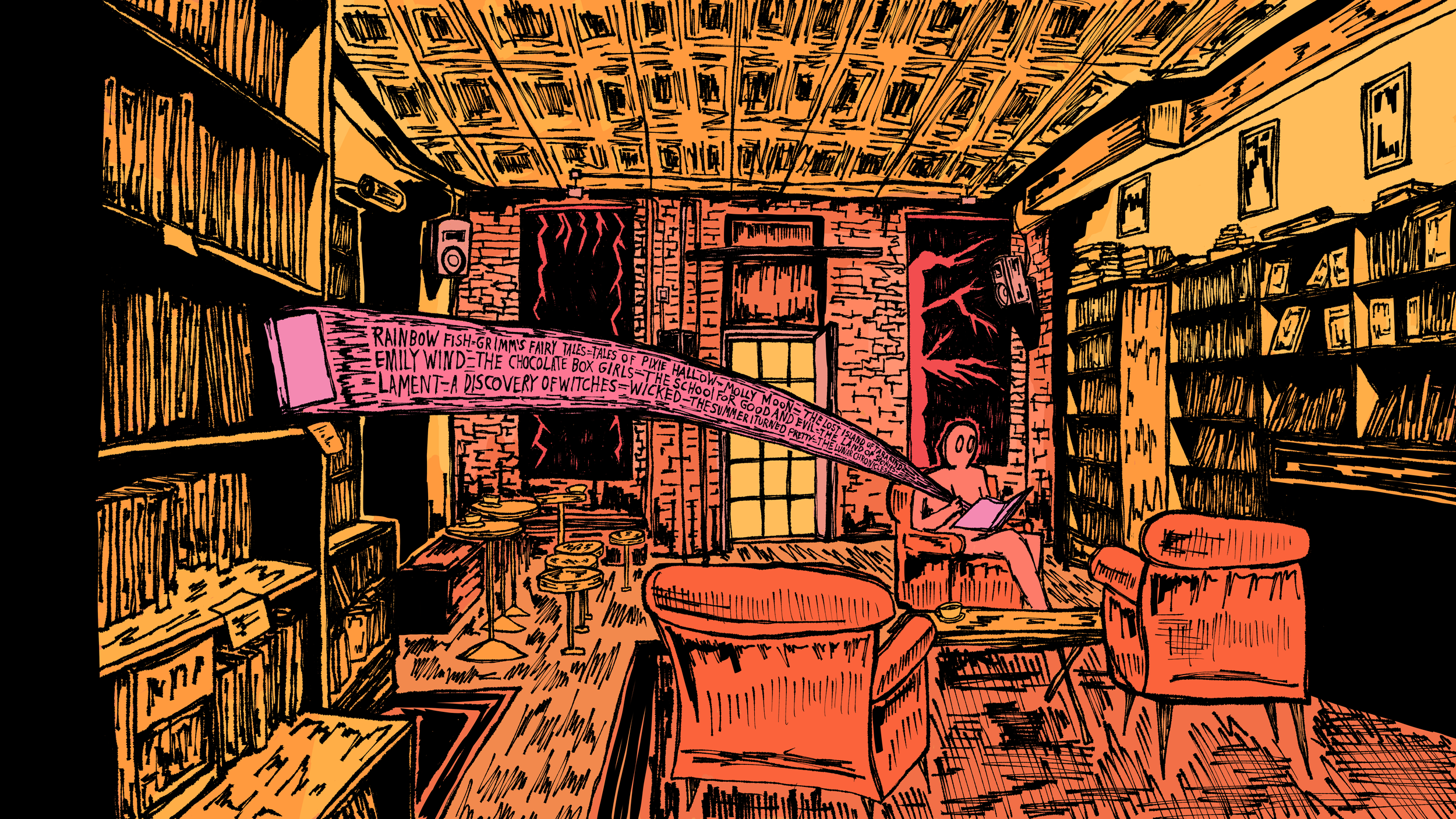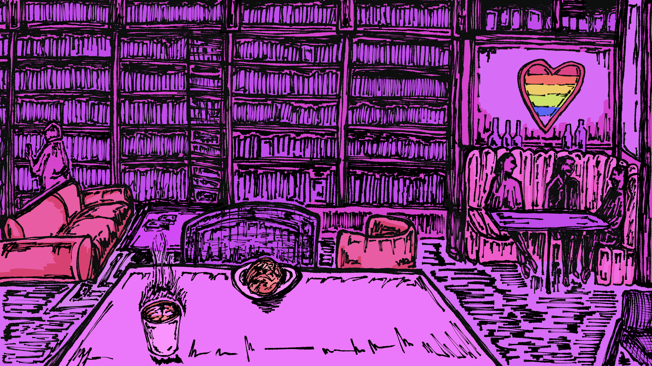 Writes & Bites is an ongoing series at the New School Free Press that reviews cafes and places to write in New York City while offering writing advice. Illustrations for this series are inspired by the interior of the place being reviewed and the associated writing topic.